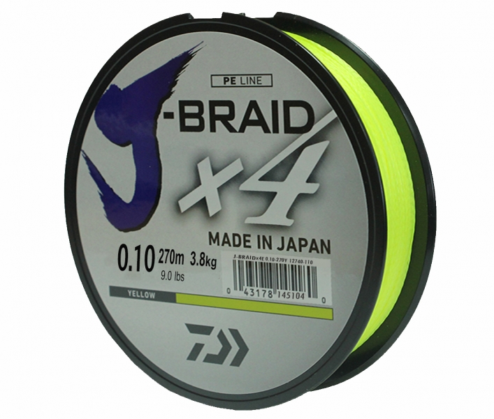 Плетёная леска DAIWA J-Braid X4, диаметр 0.10мм (#0.6), длина 270м, тест 3.8кг, 4-х жильное плетение, цвет жёлтый.
