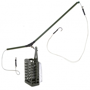 Кормушка квадратная из ударопрочного пластика 80г. Изогнутый усиленный противозакручиватель 20см, с завальцованными краями . Скоба фиксации нерж. сталь. Усиленный карабин производства США. Плетеный шнур Braid Elite, основной - ф 0.25 мм, поводок - ф 0.16 мм. Бусина-отбойник из поликарбоната. Крючок "Kumho" №8. Узлы в термоусадке.